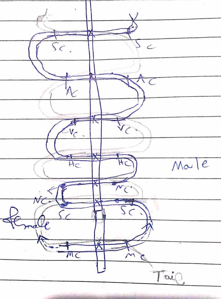 ਜਿਵੇਂ ਕਿ ਤੁਸੀਂ ਹੇਠਾਂ ਦਿੱਤੀਆਂ ਤਸਵੀਰਾਂ ਵਿਚ ਦੇਖ ਸਕਦੇ ਹੋ। ਇਕ ਸੱਪ ਨਰ ਹੈ, ਅਤੇ ਦੂਜਾ ਸੱਪ ਮਾਦਾ ਹੈ। ਅਸੀਂ ਇਹ ਪਹਿਲਾਂ ਵੀ ਦੱਸਿਆ ਹੈ ਕਿ ਮਨੁੱਖ ਦਾ ਪੂਰਾ ਰੂਪ ਕੇਵਲ ਉਸਦੀ ਦਿਮਾਗੀ ਪ੍ਰਣਾਲੀ ਵਿੱਚ ਹੁੰਦਾ ਹੈ, ਅਤੇ ਇਹ ਇੱਕ ਉਭਰੇ ਸੱਪ ਦੀ ਦਿਖ ਵਰਗਾ ਹੈ। ਸਾਡੀ ਦਿਮਾਗੀ ਪ੍ਰਣਾਲੀ ਦਾ ਮੁੱਖ ਹਿੱਸਾ ਦਿਮਾਗ ਸਮੇਤ ਪਿਛਲੇ (ਰੀੜ੍ਹ ਦੀ ਹੱਡੀ) ਵਿਚ ਹੁੰਦਾ ਹੈ। ਇਸੇ ਲਈ ਸਾਡੀ ਪਿੱਠ ਸੱਪ ਵਰਗੀ ਲੱਗਦੀ ਹੈ। ਕਿਉਂਕਿ ਕੁੰਡਲਨੀ (ਸਨਸਨੀ) ਇਸ ਸੱਪ ਦੇ ਸਰੀਰ (ਦਿਮਾਗੀ ਪ੍ਰਣਾਲੀ) ਤੇ ਚਲਦੀ ਹੈ, ਇਸ ਲਈ ਜੋ ਵੀ ਹੋਰ ਰਸਤਾ ਹੈ, ਜੇਸ ਤੇ ਕੁੰਡਲਨੀ ਚਲਦੀ ਹੈ, ਉਸ ਰਸਤੇ ਨੂੰ ਸੱਪ ਦੀ ਸ਼ਕਲ ਵੀ ਦਿੱਤੀ ਜਾਂਦੀ ਹੈ। ਦਰਅਸਲ, ਇਕ ਸੱਪ ਇਕ ਤਾਂਤ੍ਰਿਕ ਪ੍ਰੇਮੀ ਦੀ ਪਿੱਠ ਵਰਗਾ ਦਰਸ਼ਾਇਆ ਜਾਂਦਾ ਹੈ, ਅਤੇ ਦੂਸਰਾ ਸੱਪ ਇਕ ਹੋਰ ਤਾਂਤਰਿਕ ਪ੍ਰੇਮਿਕਾ ਦੀ ਪਿੱਠ ਵਰਗਾ। ਮਰਦ ਪ੍ਰੇਮੀ ਔਰਤ ਦੇ ਮੂਲਧਰਾ ਚੱਕਰ ਨਾਲ ਕੁੰਡਲਨੀ ਦੇ ਸਿਮਰਨ ਦੀ ਸ਼ੁਰੂਆਤ ਕਰਦਾ ਹੈ। ਫਿਰ ਉਹ ਕੁੰਡਲਨੀ ਨੂੰ ਸਿੱਧਾ ਵਾਪਸ ਲਿਆਉਂਦਾ ਹੈ ਅਤੇ ਇਸਨੂੰ ਆਪਣੇ ਅਧਾਰ ਤੇ ਸਥਾਪਤ ਕਰਦਾ ਹੈ। ਇਸ ਤਰ੍ਹਾਂ ਦੋਵਾਂ ਪ੍ਰੇਮੀਆਂ ਦੀਆਂ ਮੁਲਾਧਰ ਚਕਰੀਆਂ ਇਕ ਦੂਜੇ ਨਾਲ ਜੁੜੀਆਂ ਹੁੰਦੀਆਂ ਬਣ ਜਾਂਦੀ ਹਨ, ਅਤੇ ਇਕ ਕੇਂਦਰੀ ਨਬਜ਼ ਦਾ ਸ਼ਕਤੀਸ਼ਾਲੀ ਮੁਲਾਧਰ ਚੱਕਰ ਬਣਾਇਆ ਜਾਂਦਾ ਹੈ, ਜਿਸ ਨੂੰ ਤਸਵੀਰ ਵਿਚਲੇ ਕ੍ਰੋਸ ਦੇ ਨਿਸ਼ਾਨ ਨਾਲ ਬਣਾਇਆ ਗਿਆ ਹੈ। ਕੇਂਦਰੀ ਨਬਜ਼ ਨੂੰ ਸਿੱਧੀ ਬੈਰਾਜ ਵਜੋਂ ਦਰਸਾਇਆ ਜਾਂਦਾ ਹੈ ਜਿਸ ਨੂੰ ਸੁਸ਼ੁਮਨਾ ਕਿਹਾ ਜਾਂਦਾ ਹੈ। ਨਰ ਸੱਪ ਨੂੰ ਪਿੰਗਲਾ ਅਤੇ ਮਾਦਾ ਸੱਪ ਨੂੰ ਐਡਾ ਕਿਹਾ ਗਿਆ ਹੈ। ਫਿਰ ਮਰਦ ਪ੍ਰੇਮੀ ਕੁੰਡਲਨੀ ਨੂੰ ਉਪਰ ਚੜ੍ਹਾ ਦਿੰਦਾ ਹੈ ਅਤੇ ਇਸਨੂੰ ਆਪਣੇ ਸਵਾਧਿਸਥਾਨ ਚੱਕਰ ਤੇ ਬਿਠਾਉਂਦਾ ਹੈ। ਉੱਥੋਂ, ਉਹ ਉਸਨੂੰ ਸਿੱਧਾ ਅੱਗੇ ਲੈ ਜਾਂਦਾ ਹੈ ਅਤੇ ਉਸਨੂੰ ਮਾਦਾ ਤਾੰਤ੍ਰਿਕ ਦੇ ਸਵਾਧਿਸਥਾਨ ਤੇ ਸਥਾਪਿਤ ਕਰਦਾ ਹੈ। ਇਸ ਤਰ੍ਹਾਂ, ਰੀੜ੍ਹ ਦੀ ਹੱਡੀ ਦਾ ਸਵਾਧਿਸਥਾਨ ਵੀ ਕਿਰਿਆਸ਼ੀਲ ਹੋ ਜਾਂਦਾ ਹੈ। ਫਿਰ ਉਹ ਉਸਨੂੰ ਮਾਦਾ ਦੇ ਸਵਾਧਿਸਥਾਨ ਤੋਂ ਉੱਪਰ ਉਠਾਂਦਾ ਹੈ, ਅਤੇ ਉਸ ਨੂੰ ਮਨੀਪੁਰ ਚੱਕਰ ਤੇ ਬਿਠਾਉਂਦਾ ਹੈ। ਇਹ ਏਡਾ ਵਿਚ ਮਨੀਪੁਰ ਨੂੰ ਕਿਰਿਆਸ਼ੀਲ ਬਣਾਉਂਦਾ ਹੈ। ਉੱਥੋਂ ਉਹ ਇਸਨੂੰ ਸਿੱਧਾ ਵਾਪਸ ਲੈ ਜਾਂਦਾ ਹੈ ਅਤੇ ਇਸਨੂੰ ਆਪਣੇ ਮਨੀਪੁਰ ਚੱਕਰ ਵਿਚ ਸਥਾਪਿਤ ਕਰਦਾ ਹੈ। ਇਹ ਪਿੰਗਲਾ ਦੇ ਮਨੀਪੁਰ ਨੂੰ ਵੀ ਸਰਗਰਮ ਕਰਦਾ ਹੈ। ਸੁਸ਼ੁਮਨਾ ਦਾ ਮਨੀਪੁਰ ਚੱਕਰ ਖੁਦ ਹੀ ਦੋਵੇਂ ਚੈਨਲਾਂ ਦੇ ਮਣੀਪੁਰ ਚੱਕਰ ਦੇ ਕੰਮ ਕਰਨ ਕਾਰਨ ਕਾਰਜਸ਼ੀਲ ਹੋ ਜਾਂਦਾ ਹੈ। ਇਸ ਤਰੀਕੇ ਨਾਲ, ਇਹ ਕਿਰਿਆ ਸਹਿਸਰਾ ਚੱਕਰ ਤਕ ਇਸ ਤਰ੍ਹਾਂ ਚਲਦੀ ਹੈ। ਮਾਦਾ ਪ੍ਰੇਮੀ ਵੀ ਇਸ ਤਰ੍ਹਾਂ ਕੁੰਡਲਨੀ ਚਲਾਉਂਦੀ ਹੈ। ਇਸ ਤਰੀਕੇ ਨਾਲ, ਦੋ ਸੱਪ ਆਪਸ ਵਿਚ ਜੁੜੇ ਹੋਏ ਦਿਖਾਈ ਦਿੰਦੇ ਹਨ ਅਤੇ ਉਪਰ ਵੱਲ ਵਧਦੇ ਹਨ, ਅਤੇ ਰੀੜ੍ਹ ਦੀ ਹੱਡੀ ਰਾਹੀਂ ਸਹਸ੍ਰਸਾਰ ਤਕ ਪਹੁੰਚਦੇ ਹਨ।
