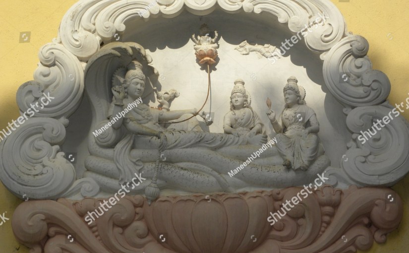 शेषनाग को क्षीर महासागर में दिखाया गया है, और उसके एक हजार फन भगवान विष्णु के सिर पर फैले हुए हैं
