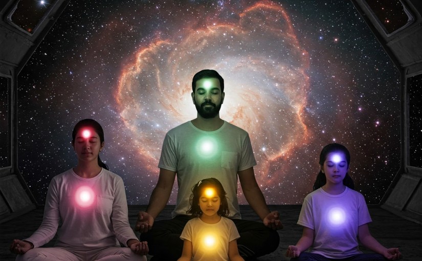 That evening, under the artificial lunar sky projection—a simulated sunset blending hues of gold and crimson—the Verma family resumed their practice. They sat together, closing their eyes, breathing deeply. The familiar vibrations of the bij mantras filled the air as each of them visualized their chosen chakra, feeling the gentle pulsations of energy rising within.